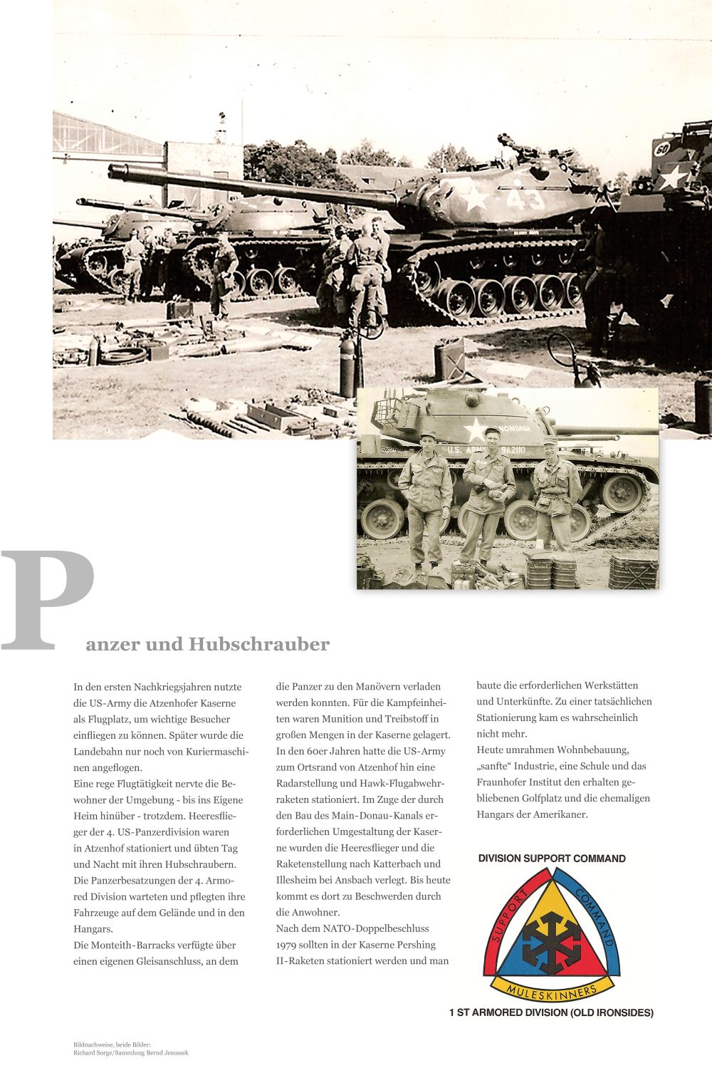 In the first post-war years, the US Army used the Atzenhofer barracks as an airfield to be able to fly in important visitors. Later the runway was only approached by courier machines. A brisk flight activity annoyed the residents of the area - even in their own home - nevertheless. Army aviators of the 4th US Armored Division were stationed in Atzenhof and practiced day and night with their helicopters. The division's tank crews stationed in Atzenhof waited and looked after their vehicles on the premises and in the hangars. The Monteith barracks had their own siding through which the tanks could be loaded for the maneuvers. Ammunition and fuel were stored in large quantities in the barracks for the combat units. In the 1960s, the US Army stationed a radar station and Hawk anti-aircraft missiles on the outskirts of Atzenhof. In the course of the reorganization of the barracks required by the construction of the Main-Danube Canal, the army pilots and the missile position moved to Katterbach and Illesheim near Ansbach. To this day there are complaints from the residents there. After the NATO double decision in 1979, Pershing II rockets were to be stationed in Monteith barracks and the necessary workshops and accommodation were built. But There any actual deployment probably never happened. Today, residential buildings, "soft" industry, a school and the Fraunhofer Institute frame the American golf course that has been preserved. |
