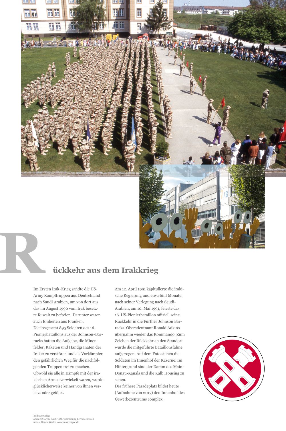 During the First Iraq War, the US Army sent combat troops from Germany to Saudi Arabia in order to liberate Kuwait, which was occupied by Iraq in August 1990. This also included units from Franconia. The total of 895 soldiers of the 16th Engineer Battalion from the Johnson Barracks had the task of destroying the minefields, rockets and hand grenades of the Iraqis and, as champions, to clear the dangerous path for the troops that followed. Fortunately, although they were all involved in fighting with the Iraqis, none of them were injured or even killed. The Iraqi government surrendered on April 12, 1991, and about five months after its relocation to Saudi Arabia, on May 10, 1991, the 16th US Engineer Battalion officially celebrated its return to the Johnson Barracks in Fuerth. Lieutenant Colonel Ronald Adkins returned to command. The battalion flag carried along was raised as a sign of returning to the site. In the photo the soldiers are standing in the courtyard of the barracks. In the back you can see the embankment of the Main-Danube Canal and the Kalb Housing. The former Paradeplatz now forms the inner courtyard of the complex commercial center (photo from 2012). |