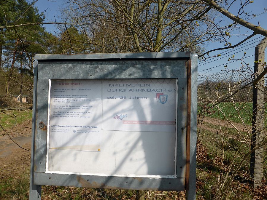 ![]() The entrance gate to the bee farm. | ![]() The "Imkerverein Burgfarrnbach" took over the area. | ![]() | ![]() The guards at the gate: the wild bees. |