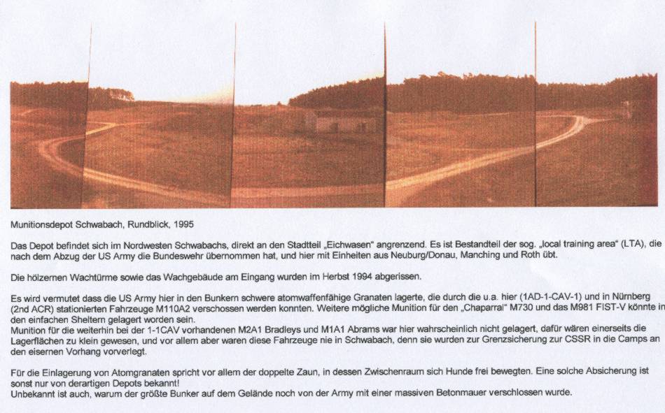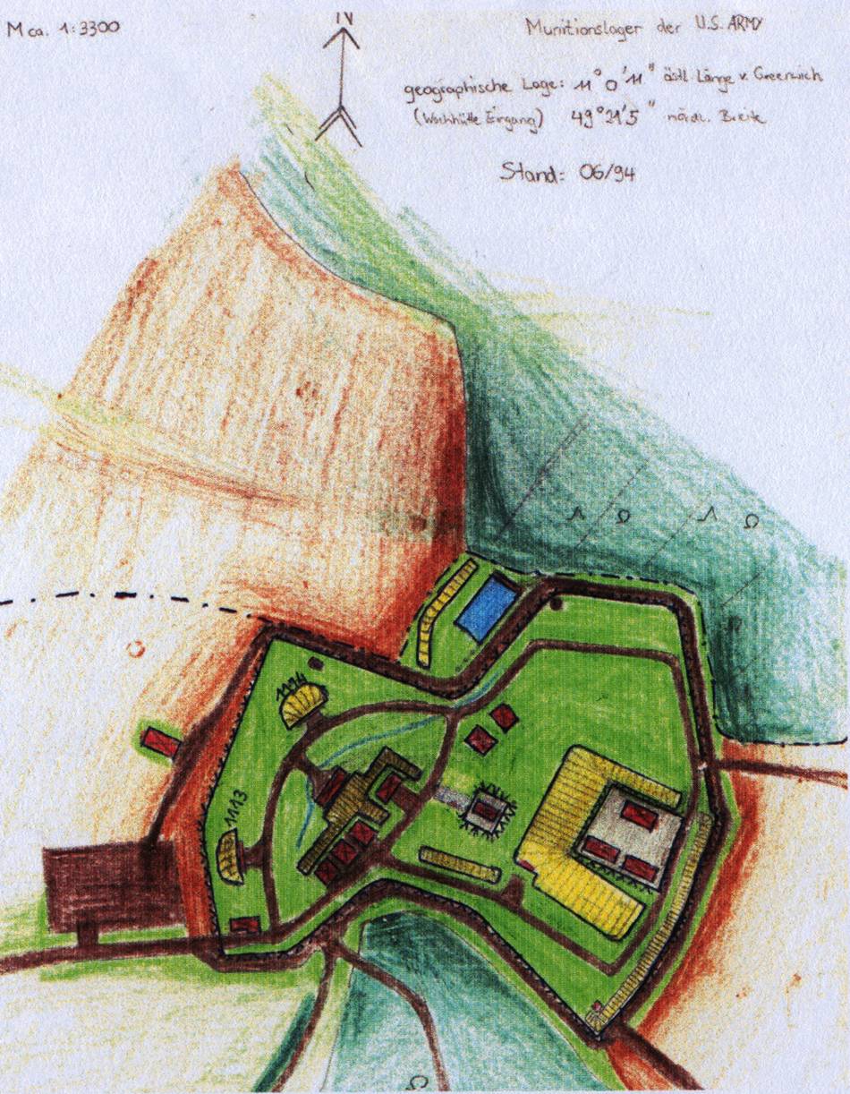 depot was part of the Local Training Area and is now used by the Bundeswehr. The wooden watchtowers and the guard house were broken down in 1994. Speculations about the storage of nuclear shells. (Informations and pictures by Oliver Geyer, Schwabach, 1995) |
