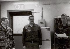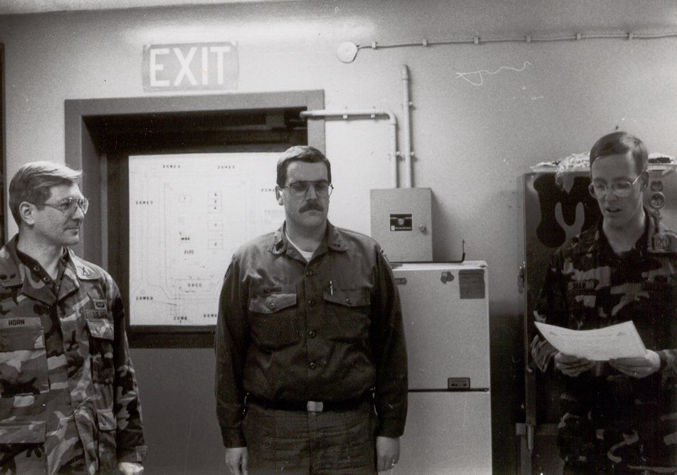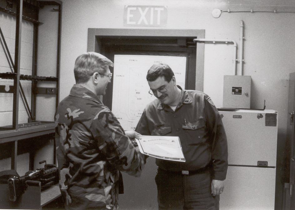 ![]() LTC Horn (left) hands a certificate to 4068 CSG Commander Schmidt for excellent duty. |