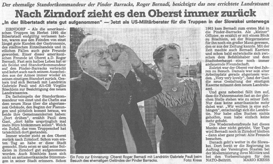 2003 Col. (Ret.) Roger Bernardi visited Pinder Bks. together with former Mayor Roeschlein and district adminstrator Gabriele Pauli (see "Fuerther Nachrichten" from 12 July 2003) |