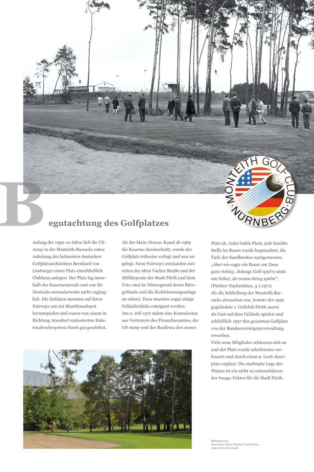 At the beginning of the 1950s, the US Army had a course and clubhouse built in the Monteith barracks under the guidance of the well-known German golf course architect Bernhard von Limburger. The course was within the barracks area and was normally not accessible to Germans. The soldiers had to play around an ammunition depot on their fairways and were well protected by a Hawk missile defense system stationed in the direction of Atzenhof. When the Main-Danube Canal cut through the barracks in 1969, the golf course was partially relocated and newly dsigned. New fairways were created between the old Vacher Strasse and the garbage dump of the city of Fuerth (on the photo you can see the office building and the shredding plant in the background). For this purpose, some pieces of land even had to be expropriated. On July 2, 1971, a commission made up of representatives from the Finance Department, the US Army and the construction company took over the new site. Every bare patch, every damp spot in the lawn was examined, the depth of the sand bunkers measured. "But as a farmer at the fence put it quite correctly: 'It's better when they play golf instead of playing war'". (Fürther Nachrichten, July 3rd, 1971) When the closure of the Monteith Barracks was foreseeable, the 1st Golf Club Fürth, founded in 1992, was able to play as a guest on the premises and finally in 1997 acquired the entire golf course from the Federal Property Administration. Many new members joined and the course was gradually improved and a 9-hole short course was added. The location of the course close to the city is an image factor for the city of Fuerth that should not be underestimated. |